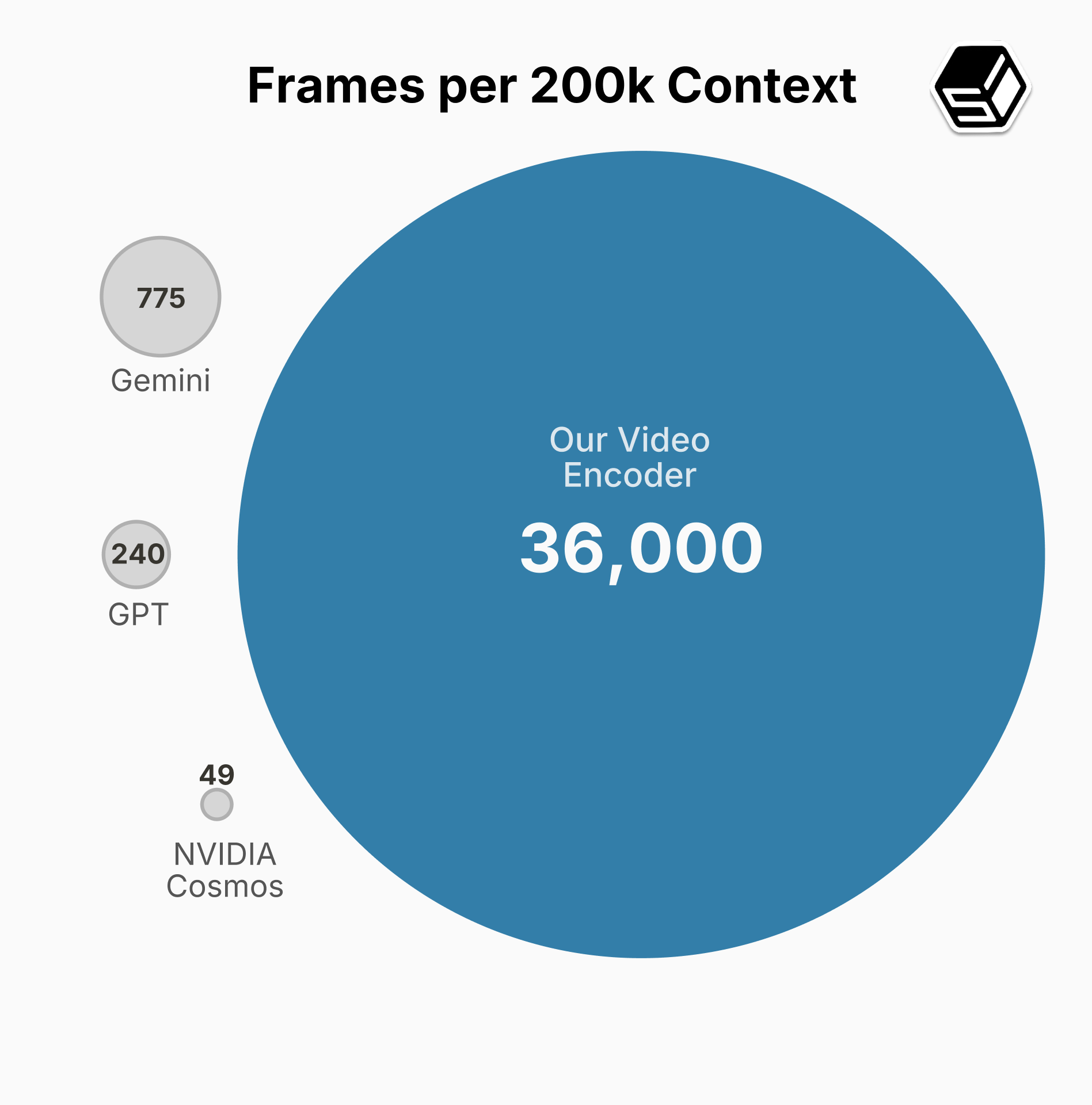 Figure 2: A chart comparing the amount of frames our tokenizer can fit in a 200k-token context window. We estimate tokens for GPT & Gemini from API documentation. [3] 3. Gemini was taken from the documentation (200,000/258= ~775). ChatGPT Computer use was taken from vision documentation with a 720x1280 screen with tile size 768 (32=6; (6129)+65=839; 200,000/839=~240. NVIDIA Cosmos CV4x8x8 was taken from the model card (1280/8) × (720/8) =160 × 90=14,400; 200,000/14,400 =13×4 =~49 input frames.