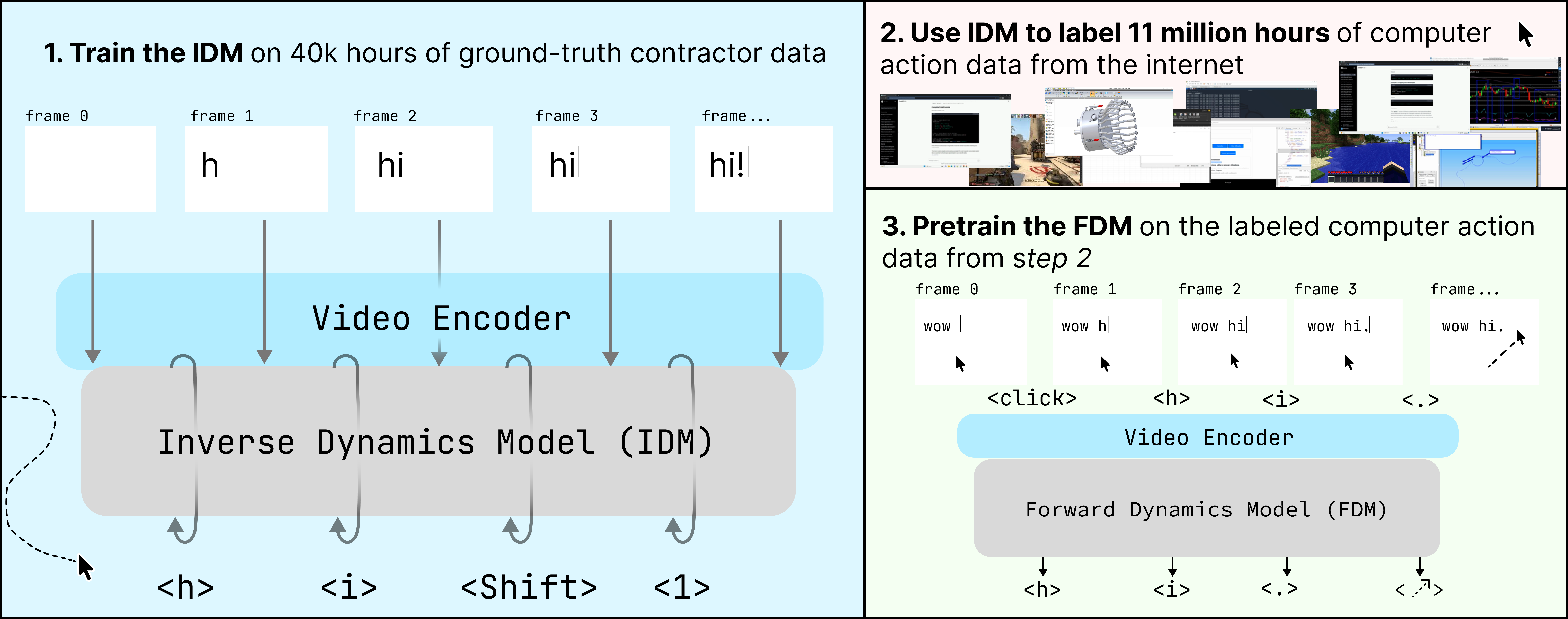 Our training recipe consists of three stages (see Figure 1). First, we train an IDM on contractor-labeled screen recordings. Second, we use the IDM to label our 11-million-hour video corpus. Finally, we use this IDM-labeled video corpus to autoregressively train a forward dynamics model (FDM) on next action prediction. The FDM’s output token space consists of keypresses and mouse movement deltas, which are expressive enough to model any actions taken on a computer.